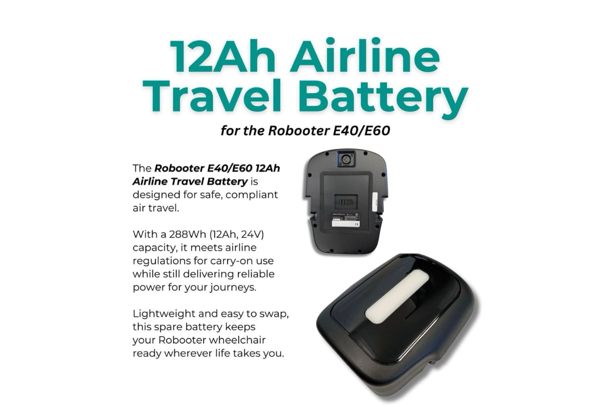 The official 12Ah lithium‑ion travel battery for the Robooter E40 and E60 power chairs.