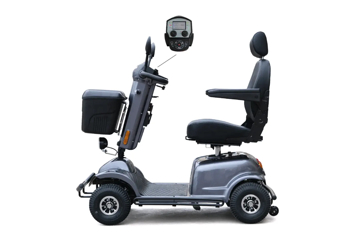 It has a long list of standard luxury features: High-power front LED headlight for maximum brightness with minimum maintenance, a comfortable high-back fully adjustable seat with headrest and armrests also adjustable, a lockable front basket, a cup holder, two mirrors, and solid steel made front, rear and side bumpers for maximum safety